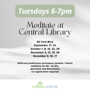 We invite you to spend a peaceful hour meditating with others at the Central Library in downtown Hamilton. The sessions will be led by experienced facilitators, giving you exposure to different approaches to mindfulness meditation from mostly guided to mostly silent. The meditation period is 30-45 minutes followed by 15 minutes of questions and discussion.