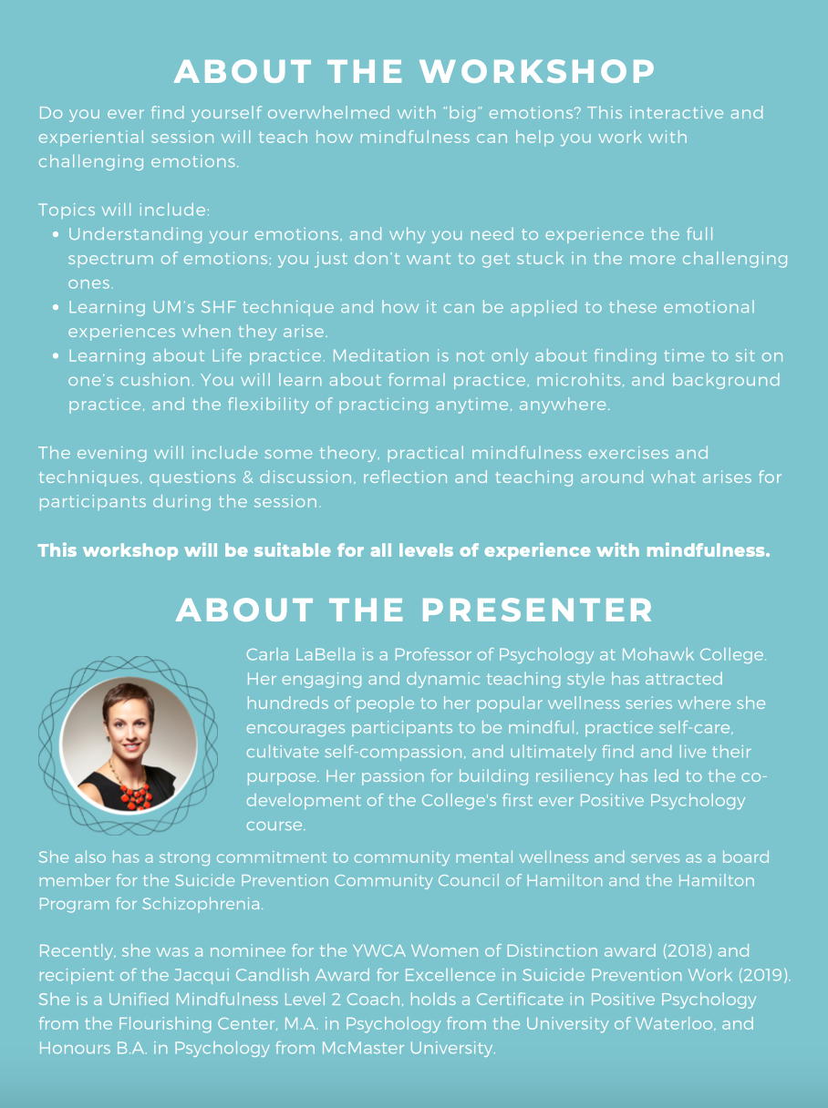 Description: Do you ever find yourself overwhelmed with “big” emotions? Please join us for this interactive and experiential session where you will learn how mindfulness can help you work with challenging emotions. Topics will include: