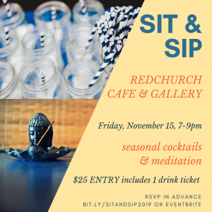 Redchurch Cafe & Gallery and Lilli Markle welcome you to the first Sit & Sip event, where you will enjoy a seasonal warm drink or refreshing cocktail in the cafe space before finding your way back to the gallery for a cozy guided meditation experience.