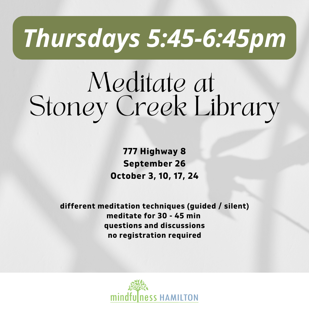 Hamilton Central Library 55 York Blvd., Hamilton, ON, CanadaJoin three experienced teachers from Mindfulness Hamilton for a free information session and panel discussion on the benefits of meditation and mindfulness.Registration is required. Please register through the library at https://hpl.libnet.info/event/11178477